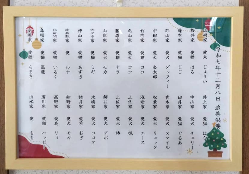 【12月度】追善供養・納骨堂ご供養 投稿日 2025年12月8日 著者 pet カテゴリー おしらせ 12月度追善供養・納骨堂ご供養を執り行いました。次回は2026年1月13日(火)9時よりお隣の南大沢霊園 2階 礼拝堂にて執り行います。お申込みは窓口、お電話にて承ります。ご供養のようすクリスマスイメージのお花をご用意いたしました🎄納骨堂ご供養のようす - シェア - ツイート - LINE - Pocket
